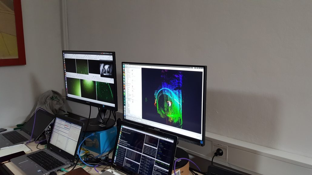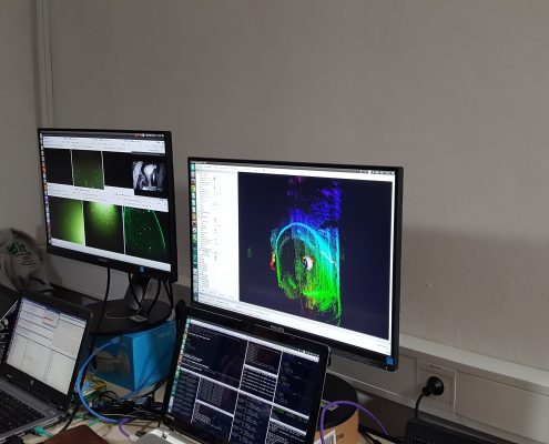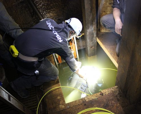 On Tuesday and Wednesday the team tested different functions of the robot, such as pitching the UX-1A completely vertical nose down and up and navigating among the obstacles (wooden debris, metal plates) in the very confined space of the shaft; the multispectral tests also continued. On Thursday three important dives were performed (two down the entire available shaft), where the multibeam sonar’s different modes (profiling and imaging) and the capabilities of the SLS system were positively tested, and the first fully autonomous mission (down to 2m depth) performed successfully. After these welcoming dives, the robot and the remaining equipment were removed from the mine.