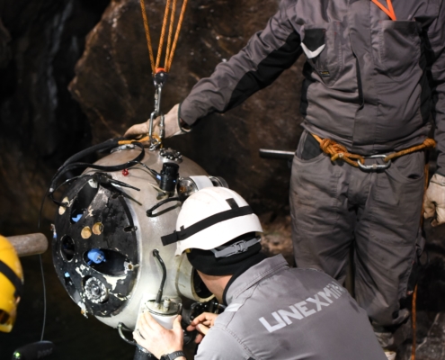 - 29nd of May (Wednesday): On the Winding shaft, a mine shaft not yet explored, UX-1a managed to dive to the maximum depth of 112m; the team learned that the bottom of the shaft was blocked by rubble. The robot also discovered new entrances into pipe workings, not yet explored. UNEXMIN’s team also succeeded in closing loops with dives from both the other two launch sites (the Pipe and Pumping shafts). This it will make it possible to create a full mine map of all areas yet explored by the UX-1 system during the three weeks of underwater exploration.