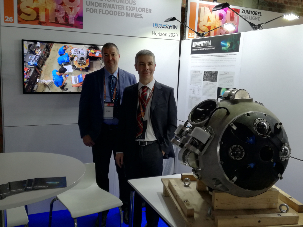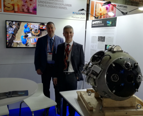 UNEXMIN was represented in two different ways. First, with a presentation given by the project coordinator, Norbert Zajzon, during under session 1 “Raw materials extraction”, a talk that was inserted onto the topic “Horizon 2020 Technology Success Stories”. As referred previously, UNEXMIN is currently seen by EASME as a successful story in the mineral raw materials group. Second, the UX-1 robot, that same robot that dived in 5 different test sites around Europe, was showcased during the first day of the event, the 18th of November.